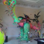 Entre las obras que el artista presenta los hay pequeños de unos cuantos centímetros, hasta un imponente alebrije articulado que Jacobo Domínguez afirma mide 7 metros aproximadamente pero que por el lugar tuvo que modificar.