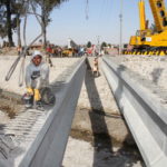 La primera etapa de la construcción del puente contempló el zampeado y limpieza de la barranca, el montaje de ocho pilotes de 14 metros de profundidad, la construcción de dos cabezales y la colocación de cuatro trabes.