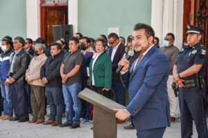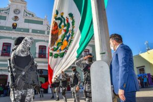 Frente al Palacio del Ayuntamiento, el edil de Huamantla señaló que desde pequeños se debe fomentar el amor y respeto a los tres símbolos patrios, que son la Bandera nacional, el escudo y el himno, que representan la historia y la soberanía de México.