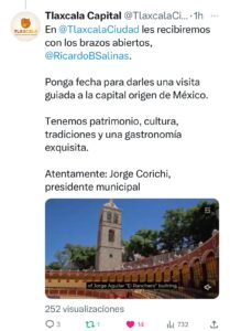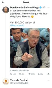 El presidente municipal Jorge Corchi invitó a través de la cuenta de twitter @TlaxcalaCiudad al empresario Ricardo Salinas Pliego, dueño del equipo Mazatlán de la Liga MX, para que visite la capital de todas y todos los tlaxcaltecas.