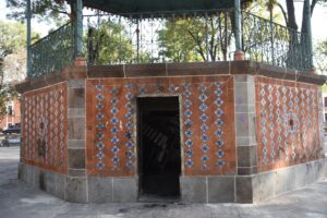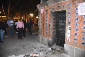 Desde el pasado miércoles, el personal limpia las pintas realizadas en fuentes y piso de la Plaza de la Constitución y se trabaja para sustituir la puerta del kiosko que fue quemada.
