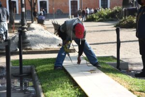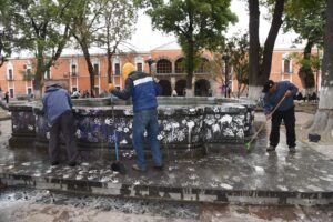 Trabajadoras y trabajadores del área de servicios públicos del Ayuntamiento de Tlaxcala realizan exhaustivas tareas de limpieza en el Centro Histórico.