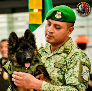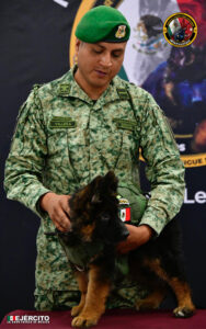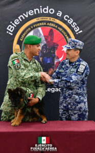 El perrito, de tres meses de edad, fue recibido con una ceremonia realizada en el Aeropuerto Internacional de la Ciudad de México (AICM) la mañana de hoy, 2 de mayo de 2023, encabezada por elementos del Ejército mexicano.