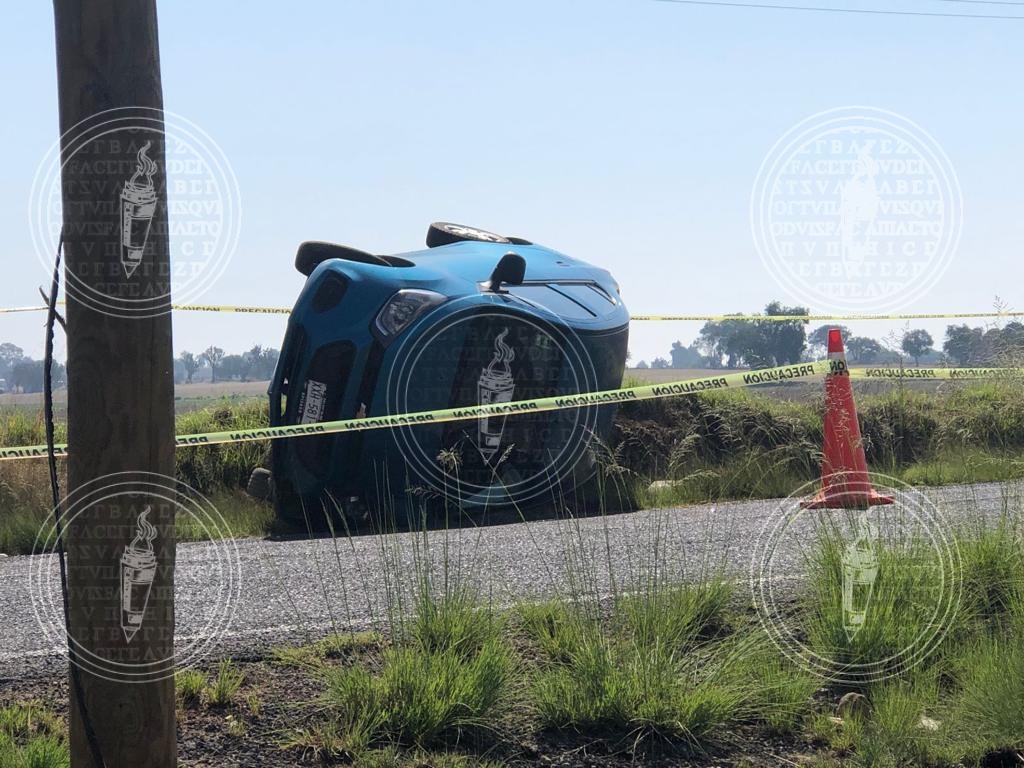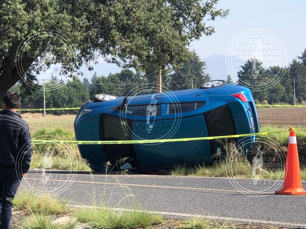 Presuntamente, por el exceso de velocidad, el conductor de un vehículo Chevrolet Beat de color azul, con placas XXH-581A del estado de Tlaxcala, volcó aparatosamente.