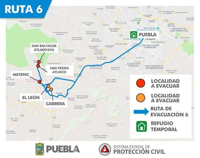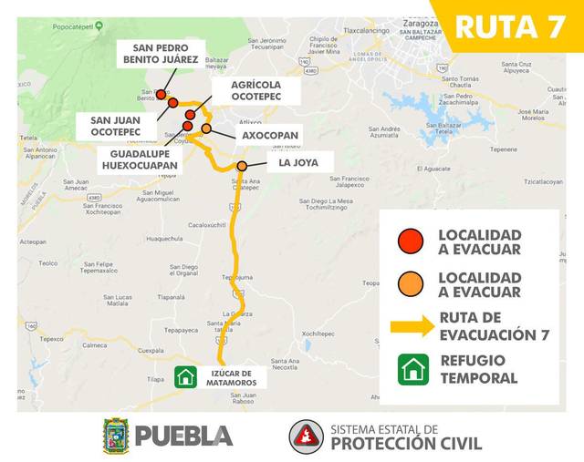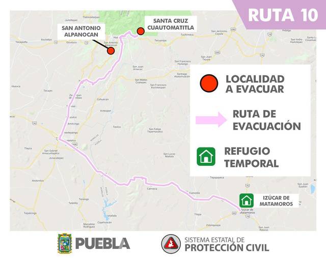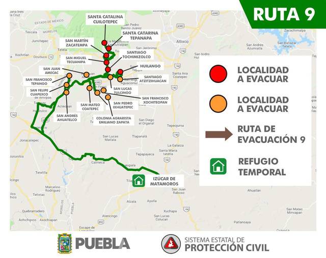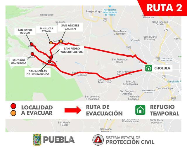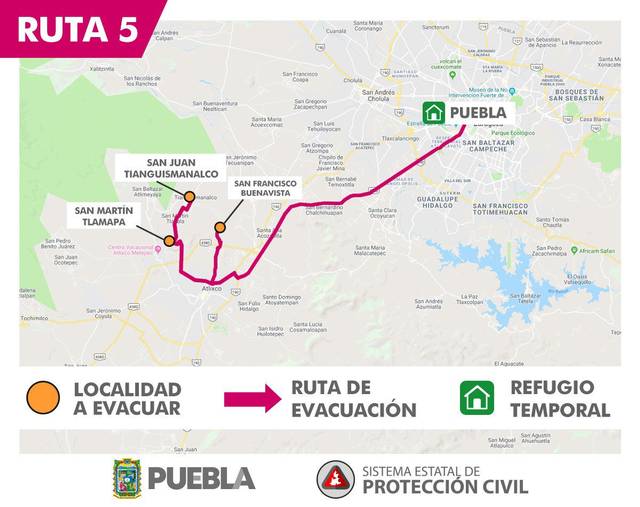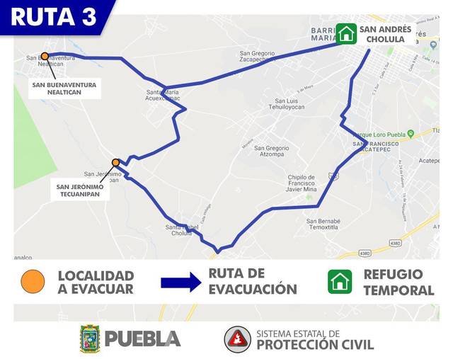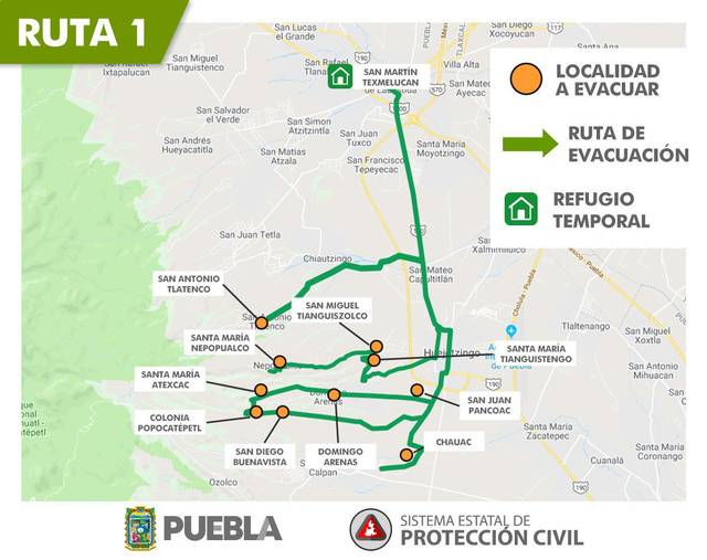 RUTA 1 – Para evacuar San Antonio Tlatenco, Sta. Ma. Nepopualco, Sta. Ma. Atexcac, Col. Popocatépetl, San Diego Buenavista, Domingo Arenas, San Juan Pancoac, Sta. Ma. Tianguistengo, San Miguel Tianguizolco a San Martín Texmelucan.