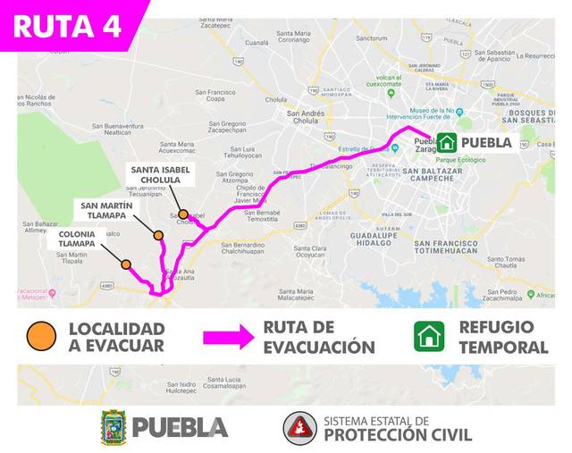 RUTA 4 – para evacuar Santa Isabel Cholula, San Martín Tlamapa y Colonia Tlamapa a ciudad de Puebla.