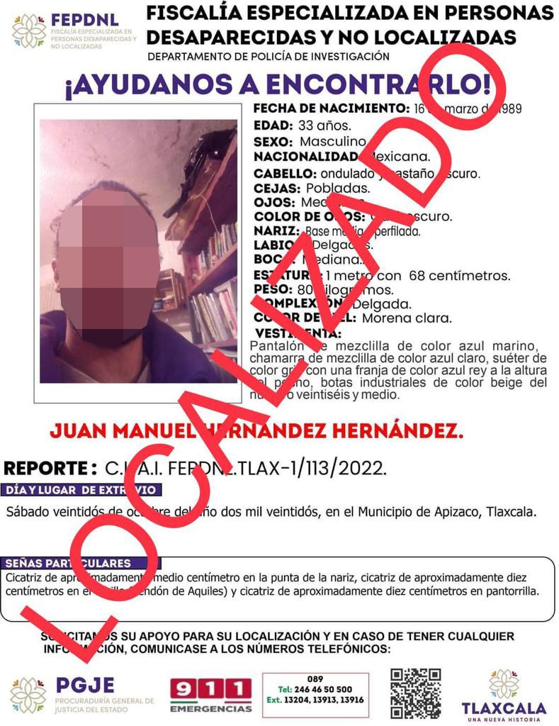 Al ejecutar labores de búsqueda, elementos de Investigación de la Fepdnl localizaron al hombre en el municipio de Yauhquemehcan, donde se identificaron plenamente y le solicitaron que los acompañara ante representante social, derivado de la denuncia que existía por su desaparición.