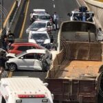 Poco antes de las 15:00 horas, un automóvil blanco de la marca Volkswagen y una camioneta Ford roja fueron embestidas por la unidad pesada.