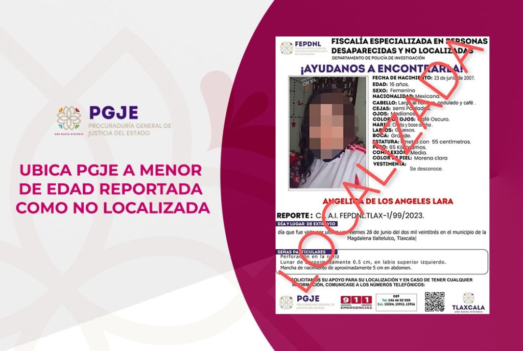 Elementos de la Policía de Investigación adscritos a la Fiscalía Especializada en Personas Desaparecidas y No Localizadas (Fepdnl) de la Procuraduría General de Justicia del Estado (PGJE) localizaron a una menor de edad reportada como desaparecida.