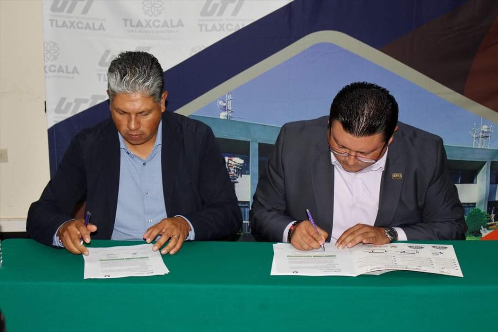 El rector de la Universidad Tecnológica de Tlaxcala (UTT), Moctezuma Bautista Vásquez y el presidente de la Cámara Nacional de la Industria de Transformación (Canacintra), delegación Tlaxcala, Carlos Tamayo Chavero, firmaron convenio de colaboración, con el objetivo de que alumnas y alumnos de las diferentes ingenierías puedan realizar prácticas en empresas afiliadas a la organización.