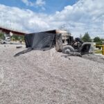 El conductor de un tráiler cargado de grava murió al sufrir una aparatosa volcadura en la que cayó desde un puente carretero y, además, terminó parcialmente calcinado.