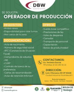 El H. Ayuntamiento de Huamantla, que preside Salvador Santos Cedillo, invita al reclutamiento de la empresa DBW Advanced Fiber Technologies, que se realizará este jueves 9 de noviembre a las 10:00 horas en las oficinas de la Coordinación de Desarrollo Económico de Huamantla, las cuales están ubicadas en bulevar Cuamanco esquina con Reforma S/N.
