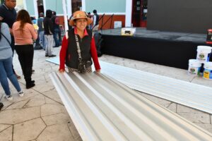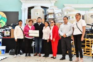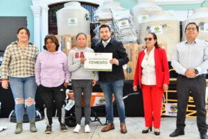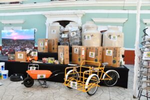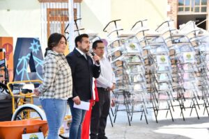 “Hoy vamos a entregar diversos apoyos en beneficio de las y los estudiantes del municipio, entre las que se encuentran mobiliario escolar, equipos de cómputo, malla sombras; materiales de construcción como láminas, botes de pintura, tinacos; así como sillas de ruedas, un triciclo para el apoyo de la venta de productos, entre otras”, mencionó.