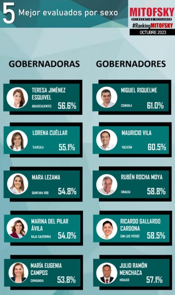 En el caso de gobernadores mejor evaluados, el titular del Ejecutivo local de Coahuila, Miguel Riquelme encabeza la lista, con 61.0 por ciento, después Mauricio Vila con 60.5 por ciento de Yucatán, Rubén Rocha Moya con 58.8 por ciento de Sinaloa, Ricardo Gallardo Cardona con 58.5 de San Luis Potosí y Julio Ramón Menchaca con 51.1 por ciento de Hidalgo.