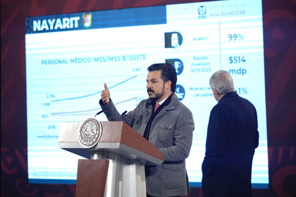 Indicó que, de 2018 a la fecha, en Nayarit el incremento del personal de enfermería es de 40 por ciento, médicos se han contratado mil 006, lo que representa un incremento del 84 por ciento de especialistas y 10 por ciento médicas y médicos generales. Se han invertido 514 millones de pesos en equipamiento y el número de camas se incrementó uno por ciento; el abasto de medicamentos se ubica en 99 por ciento.