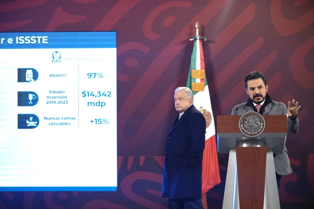 Indicó que el abasto de medicamentos en las 23 entidades donde opera el modelo de salud es de 97 por ciento y se han invertido 14 mil 342 millones de pesos en equipo para unidades médicas de IMSS-Bienestar, lo cual incrementó 15 por ciento las camas censables.