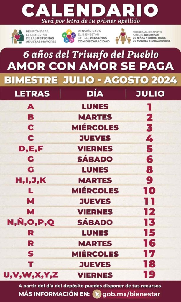 A partir del lunes 1 de julio, se efectuarán los depósitos para las personas inscritas en la Pensión para el Bienestar de las Personas Adultas Mayores, la Pensión para el Bienestar de Personas con Discapacidad y el Programa para el Bienestar de las Niñas y Niños, Hijos de Madres Trabajadoras.