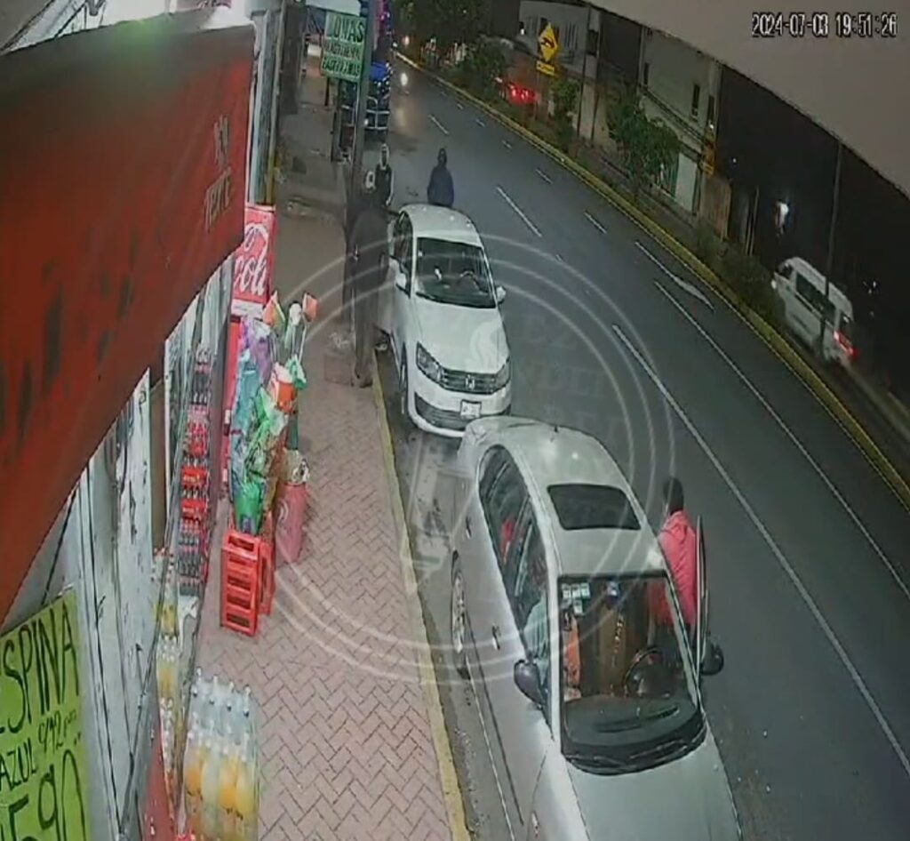 A través de un video se puede apreciar como tres individuos bajan de un automóvil, aparentemente un Spark gris, cruzan el camellón y se dirigen apresuradamente hacia un vehículo blanco Volkswagen, amedrentando al conductor que había descendido y a su familia, quienes se resguardan en el depósito de refrescos.