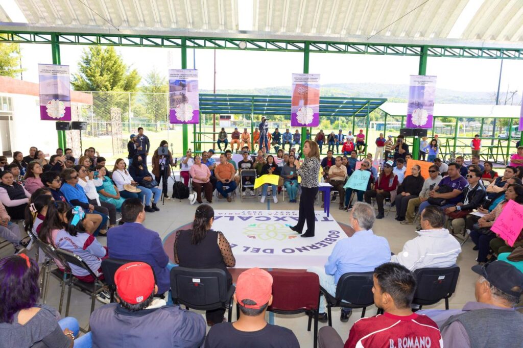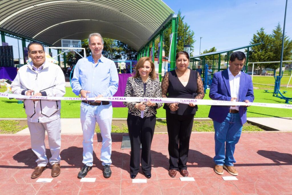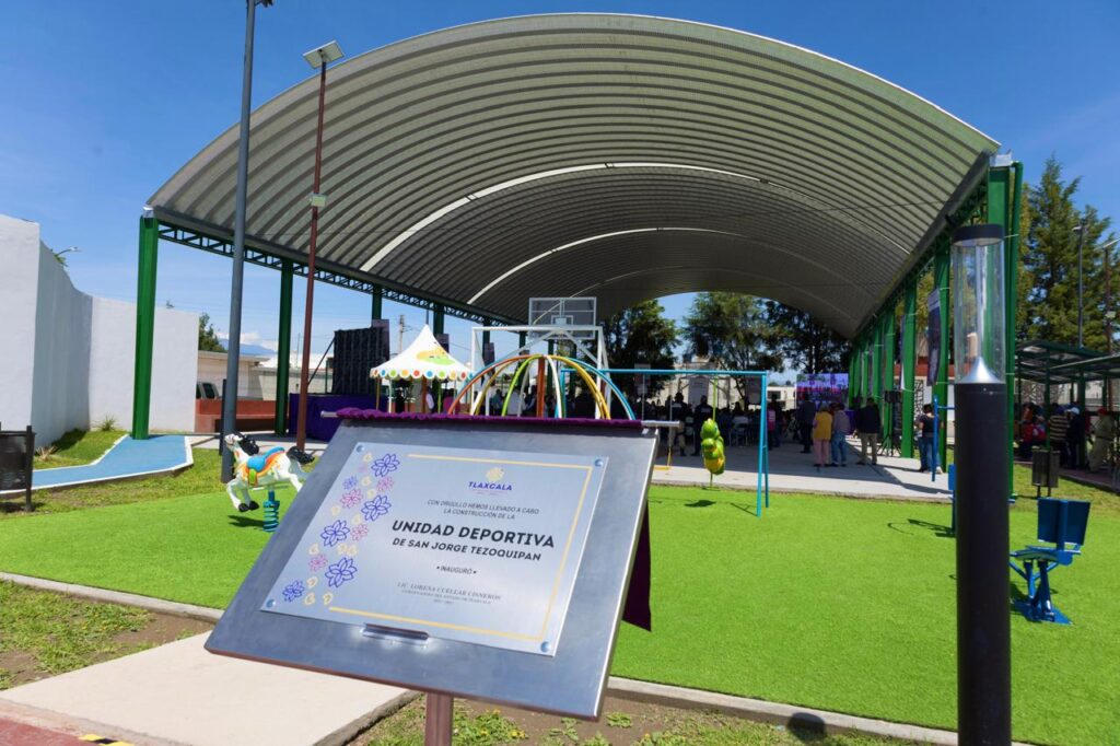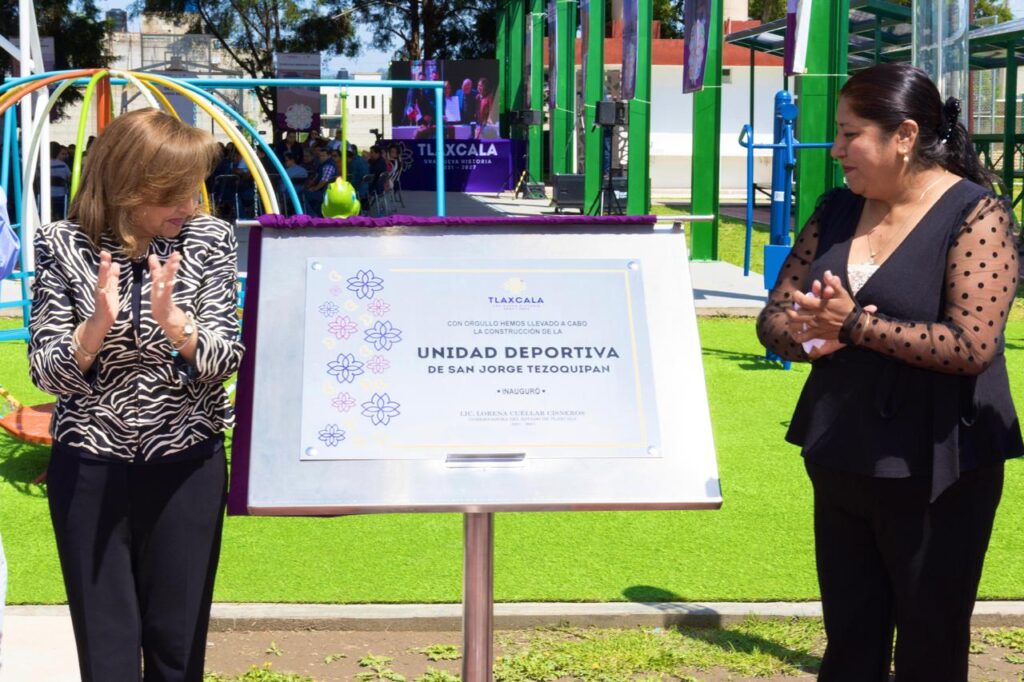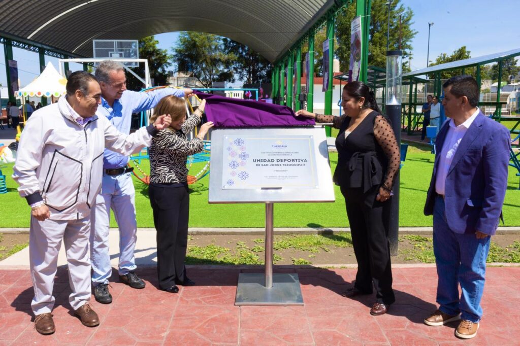 La gobernadora Lorena Cuéllar Cisneros inauguró la Unidad Deportiva de San Jorge Tezoquipan, en el municipio de Panotla, donde reiteró su compromiso con el deporte, que ha traído diversos beneficios a la entidad en materia turística, pues ha sido la llave para dar a conocer a la entidad en el mundo y para generar el desarrollo económico, como lo refleja la apertura de 22 nuevos hoteles, entre otros.