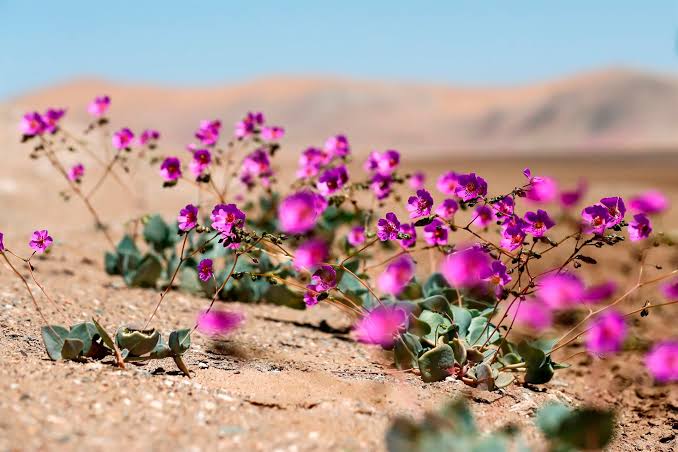 En el norte de Chile, conocido por ser uno de los lugares más secos de la Tierra, ha sorprendido este año con una colorida proliferación de flores blancas y púrpuras, cubriendo franjas de su habitual arena árida.