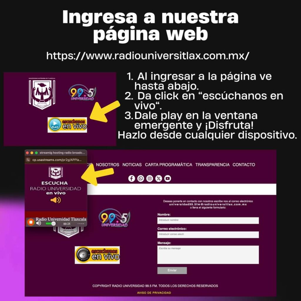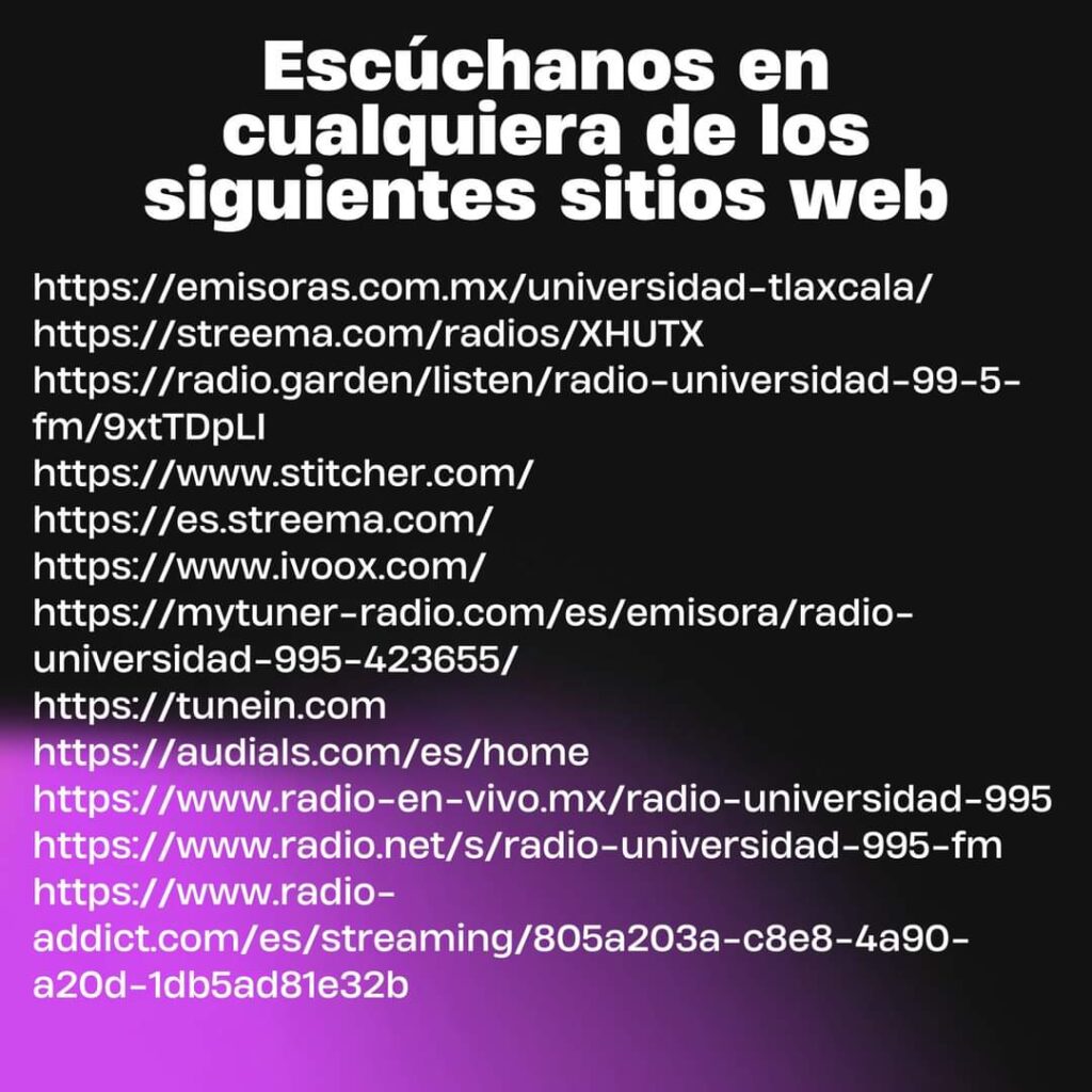 Checa en las siguientes imágenes cómo puedes escuchar Radio Universidad en sus diferentes plataformas y páginas: