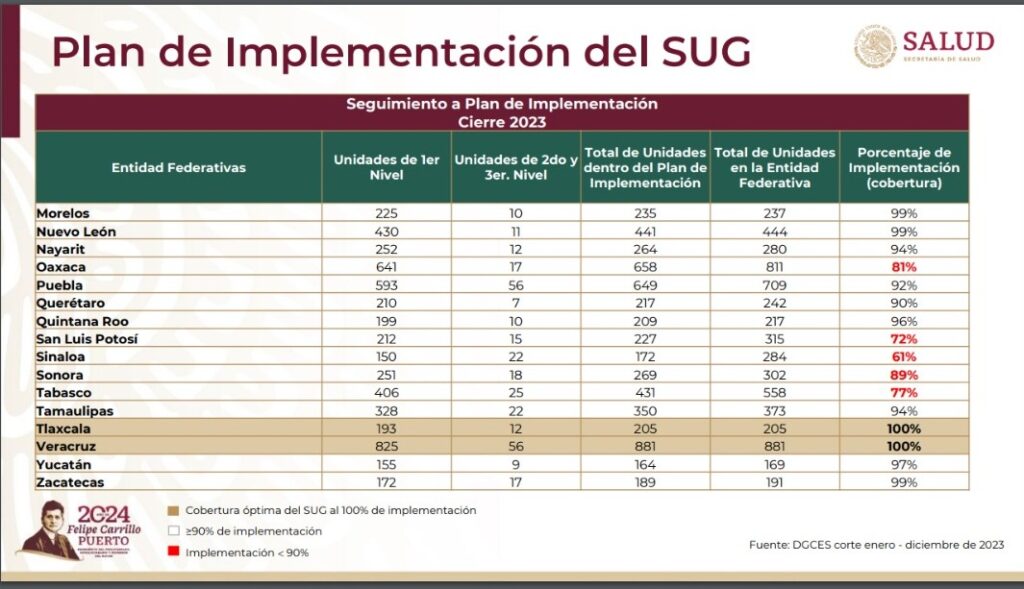 A través de la dirección general de calidad y educación en salud del gobierno federal, se informó el seguimiento al Plan de Implementación de este sistema, mismo que en Tlaxcala se aplicó en sus 12 hospitales, así como en las 193 Unidades Médicas y Centros de Salud de primer nivel, cumpliendo un total de 205 unidades dentro del Plan de Implementación que representan el 100 por ciento de cobertura del SUG.