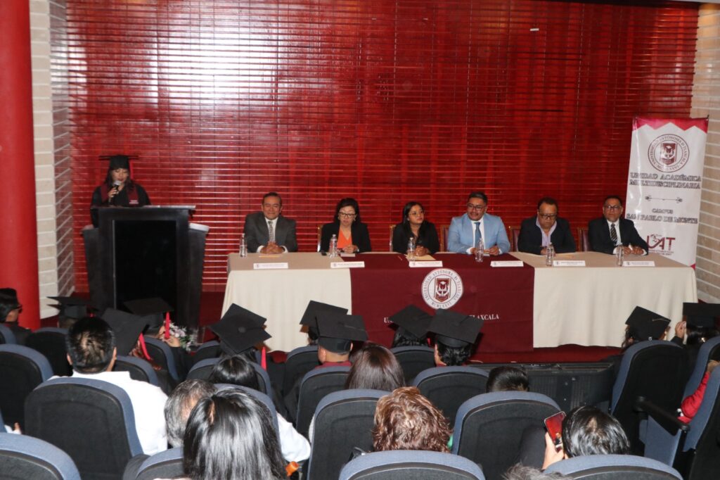 En representación del Doctor Serafín Ortiz Ortiz, Rector de la UATx, la Doctora Lilibeth Portillo los exhortó a continuar con su preparación profesional y practicar los valores y la filosofía que les acompañó en su trayectoria por la Institución
