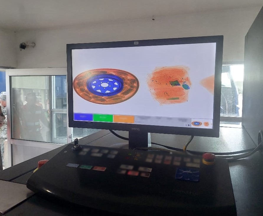 Al continuar la revisión, los elementos detectaron que dos llantas de refacción, atornilladas a los costados del remolque, tenían inconsistencias en su forma, por lo que fueron sometidas a una máquina de rayos X, detectándose la presencia de material con una densidad irregular.