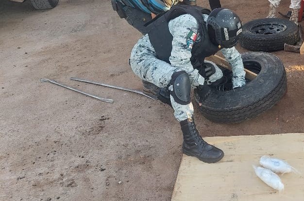 En Sonora, Guardia Nacional asegura posible metanfetamina, oculta en llantas de refacción y en hielera