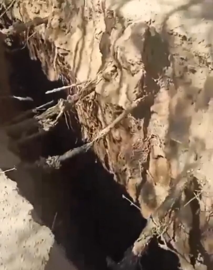 A través de redes sociales, los residentes de la zona comenzaron a difundir videos de la zanja, la cual aparentemente atrapó a varios becerros que se encontraban pastando en el área.