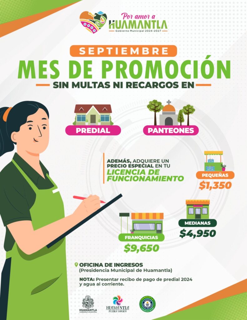 El Ayuntamiento de Huamantla anuncia que todo el mes de septiembre lanzará promociones especiales en el pago de impuestos y permisos en apoyo a la economía familiar y de los comercios.
