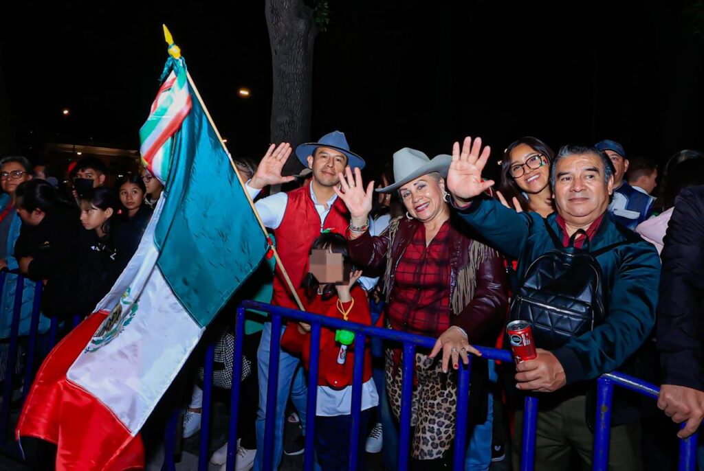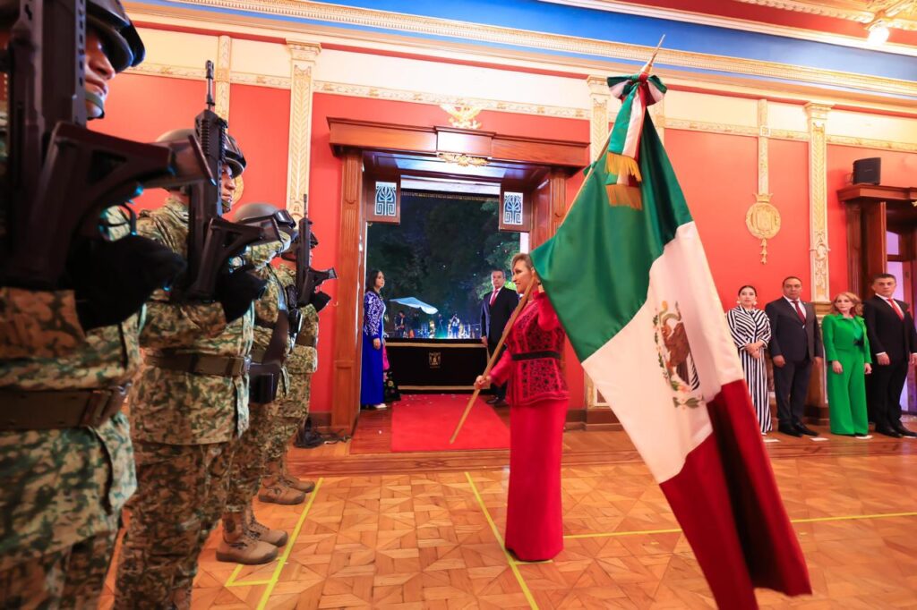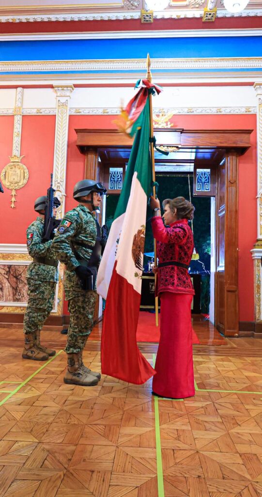 Desde el balcón central del Palacio de Gobierno, acompañada por sus hijas Mariana y Fernanda Espinosa de los Monteros Cuéllar, así como de su esposo Salvador Ballesteros Rodríguez, la gobernadora ondeó la Bandera Nacional y recordó a los hombres y mujeres que participaron en el movimiento de Independencia.