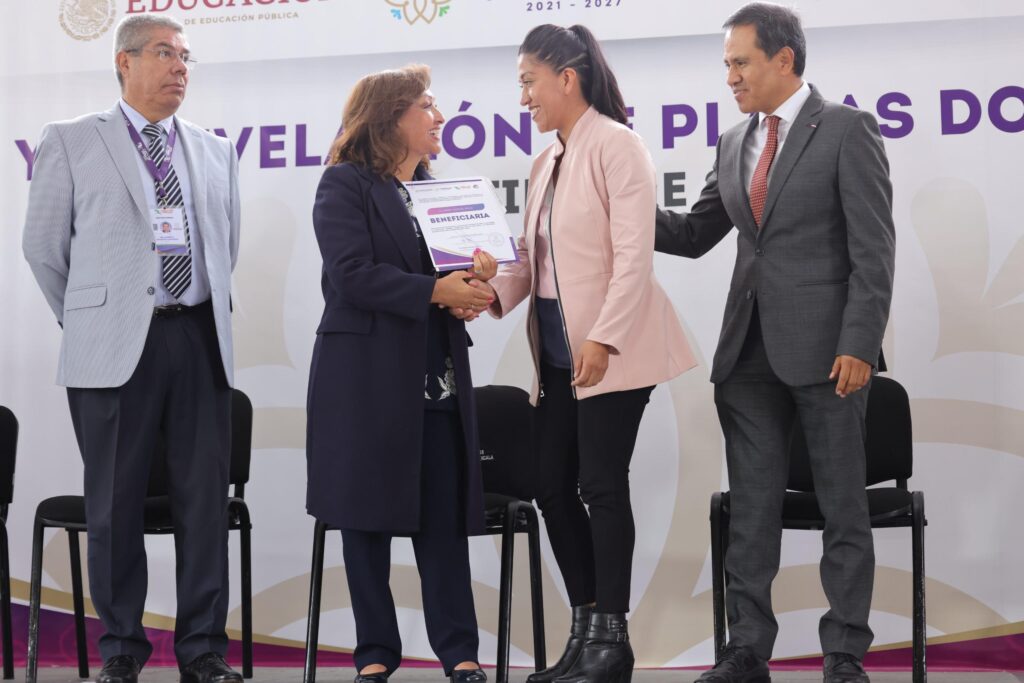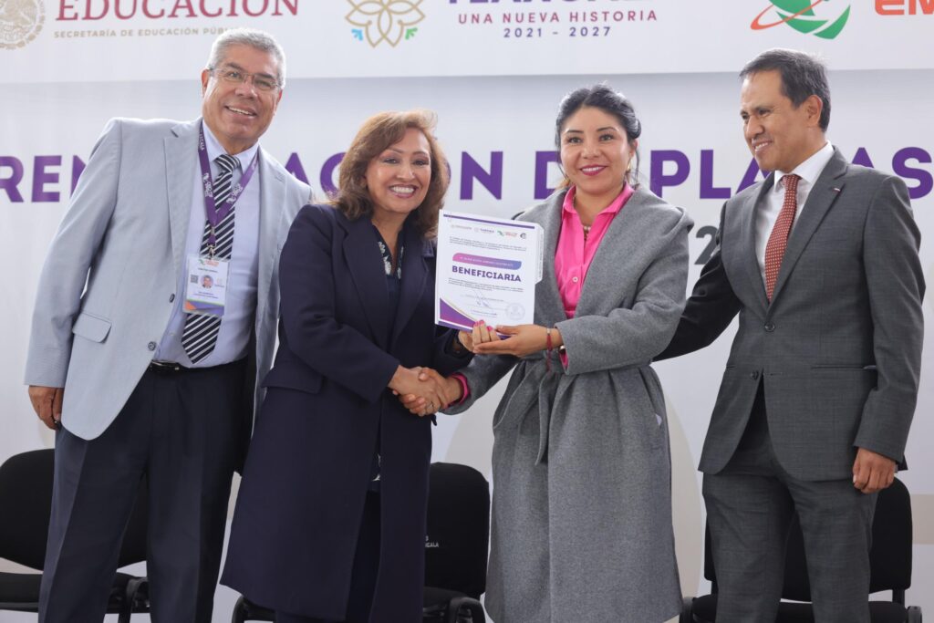 La gobernadora Lorena Cuéllar Cisneros entregó una serie de prestaciones a personal docente del subsistema Colegio de Estudios Científicos y Tecnológicos de Tlaxcala (CECyTE)- Educación Media Superior a Distancia (EMSaD), como parte del fortalecimiento a la homologación, renivelación y retabulación de plazas en este sistema educativo; además, entregó siete nombramientos.