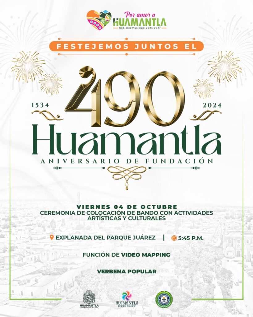 El Ayuntamiento de Huamantla invita a la ciudadanía a la ceremonia de colocación del Bando Solemne Conmemorativo al 490 aniversario de la fundación de la ciudad, en un acto que tendrá lugar este viernes 4 de octubre en el Parque Juárez, a las 18:00 horas.
