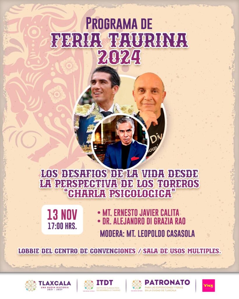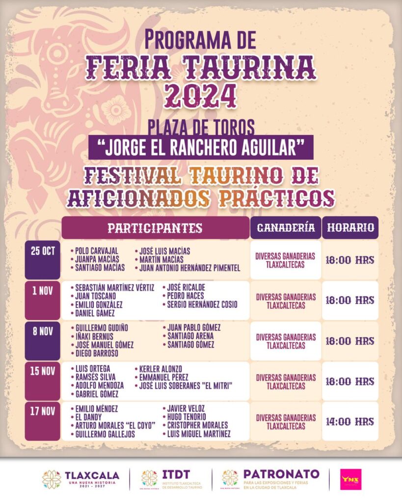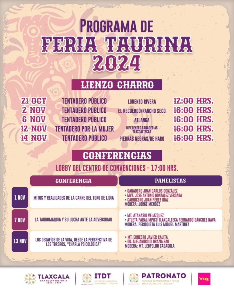 El gobierno del estado, a través del Instituto Tlaxcalteca de Desarrollo Taurino (ITDT), que dio a conocer el programa completo de eventos culturales y taurinos, cuyas actividades, aunadas a las Corridas de “Tlaxcala, la Feria de Ferias 2024”, ofrecerán una extraordinaria oferta para la gran afición de la capital llena de tradición, así como para el turismo que la visita.