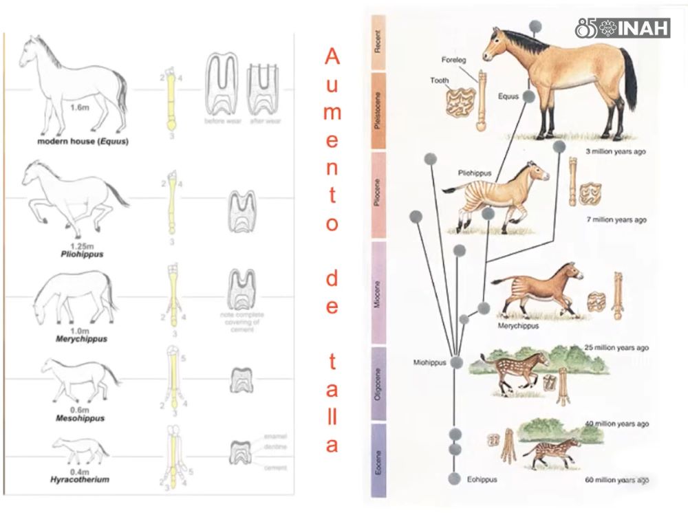 En el marco del Día Internacional de los Fósiles, celebrado el 16 de octubre, el Consejo de Paleontología (ConPal), del Instituto Nacional de Antropología e Historia (INAH), órgano de la Secretaría de Cultura federal, comparte una historia de casi 60 millones de años (Ma), la cual se lee en los huesos fosilizados de distintas especies de la familia Equidae, mamíferos del orden Perissodactyla (característicos por tener número de dedos impar), que van desde el Hyracotherium (Eohippus), de talla pequeña similar a la de un perro mediano, que habitó en el Eoceno, hace 55 Ma, hasta las robustas bestias de talla alta que volvieron a pisar América, apenas hace 500 años, traídas por Hernán Cortés.