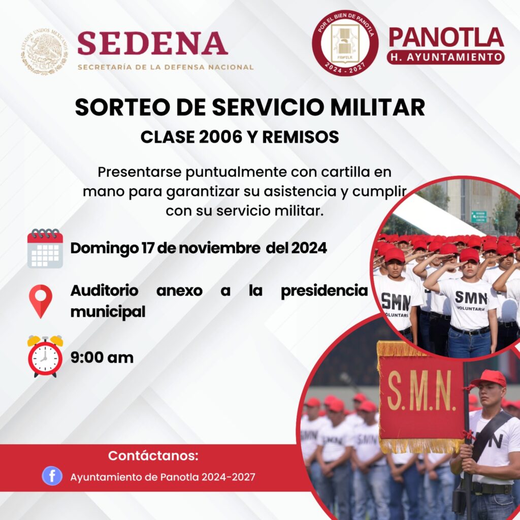 El Ayuntamiento de Panotla dio a conocer que el próximo domingo 17 de noviembre, a las 9:00 horas, se llevará a cabo el Sorteo del Servicio Militar 2024, para los jóvenes que tramitaron su cartilla clase 2006 y remisos.