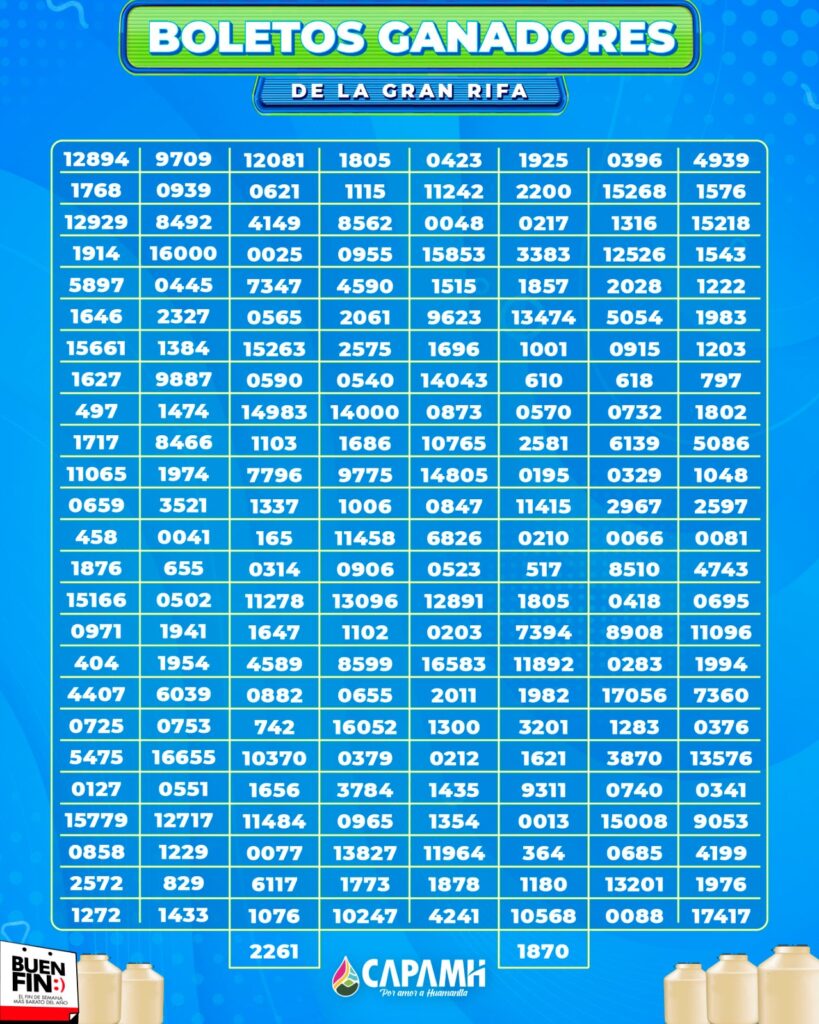 Los ganadores podrán recibir su premio a partir del próximo lunes 2 de diciembre en las oficinas de la Capamh, ubicadas en Calle del Pozo 107, barrio de San José, Huamantla, y deben presentar recibo de pago de servicio, copia de INE y el boleto con el número ganador, en un horario de 8:00 a 15:00 horas.