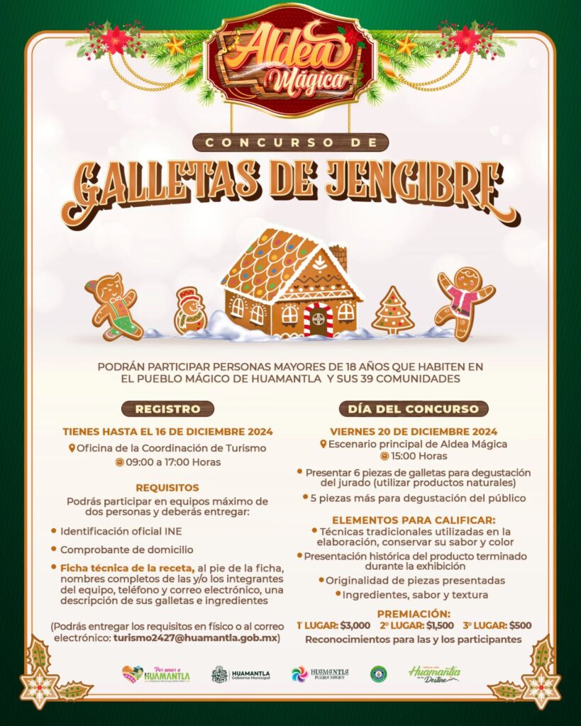La Coordinación de Turismo del municipio de Huamantla abrió la convocatoria para el Concurso de Galletas de Jengibre, un evento que se celebrará el próximo viernes 20 de diciembre, a las 15:00 horas, en el escenario principal de la Aldea Mágica, en el marco de las festividades navideñas.