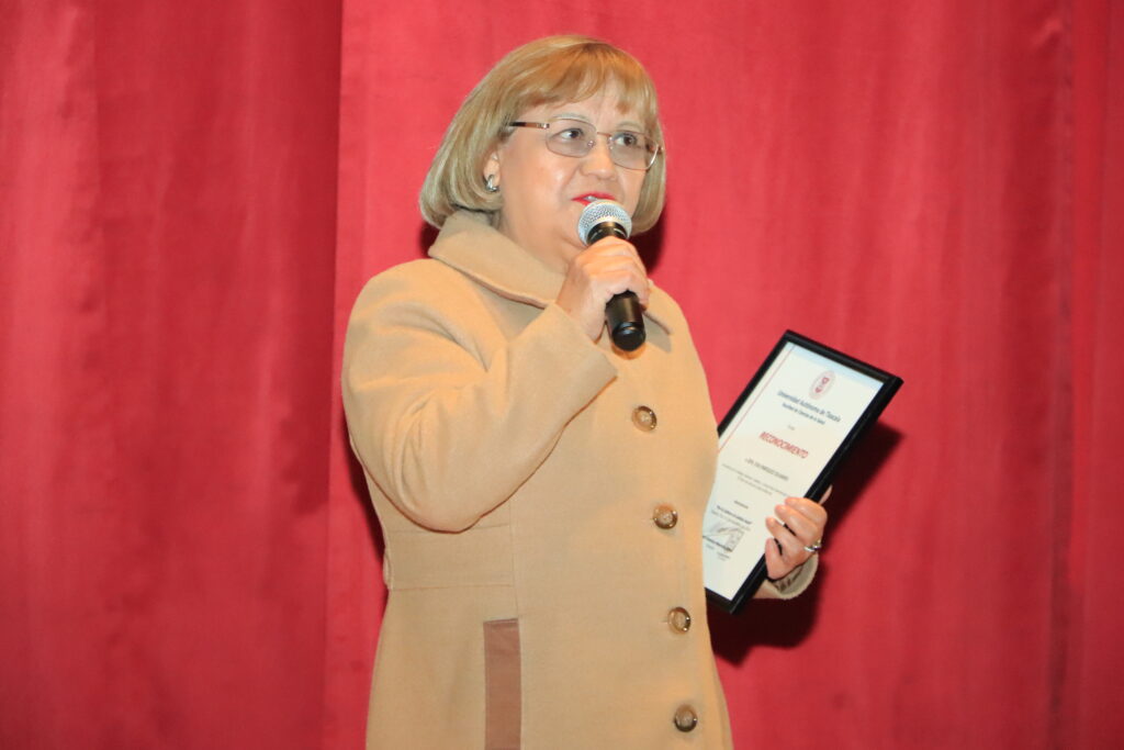 Como parte del XI aniversario de creación de la Licenciatura en Química Clínica, se entregó un reconocimiento a la Química Farmacobióloga Eva Enríquez Olivares por su compromiso y aportación a la preparación de los profesionales de las ciencias de la salud a lo largo de 25 años de servicio en esta Facultad.