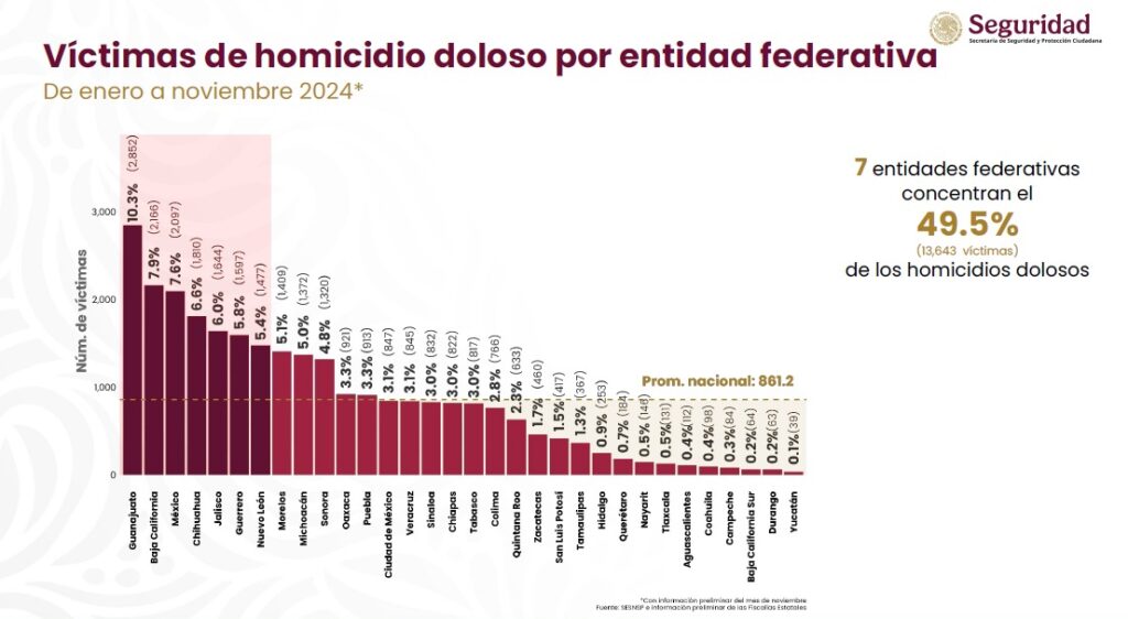 Al corte del mes de noviembre, siete entidades federativas concentraron el 49.5 por ciento de los homicidios dolosos en México, equivalente a 13 mil 643 casos, y son Guanajuato, con dos mil 852; Baja California, con dos mil 166; Estado de México, con dos mil 097; Chihuahua, con mil 810; Jalisco, con mil 644; Guerrero, con mil 597 y Nuevo León, con mil 477.