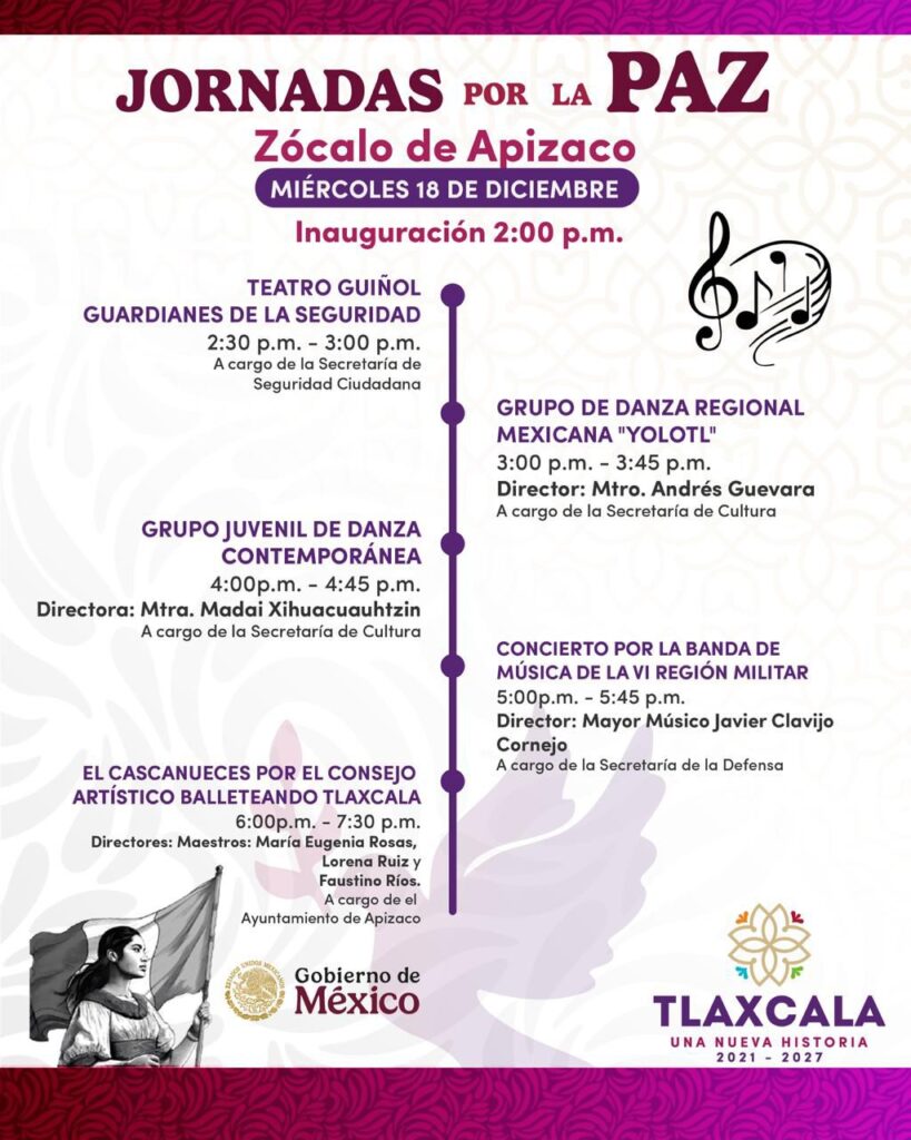 Este miércoles 16 de diciembre en punto de las 2:00 pm se llevará a cabo la inauguración de las actividades de las Jornadas por la Paz, a cargo de la Secretaría de Seguridad Ciudadana, Secretaría de Cultura, Secretaría de Defensa y el H. Ayuntamiento de Apizaco para promover la paz en nuestro municipio.
