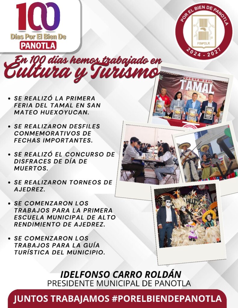 Con el objetivo de promover la riqueza cultural y turística de Panotla, se llevaron a cabo eventos como la Feria del Tamal en San Mateo Huexoyucan, desfiles conmemorativos a fechas importantes, concurso de disfraces y ofrendas por día de muertos y torneos de ajedrez que dieron el impulso para crear el proyecto de la primera Escuela Municipal de Alto rendimiento de Ajedrez; estas actividades han contribuido a posicionar al municipio como un destino atractivo en la región.