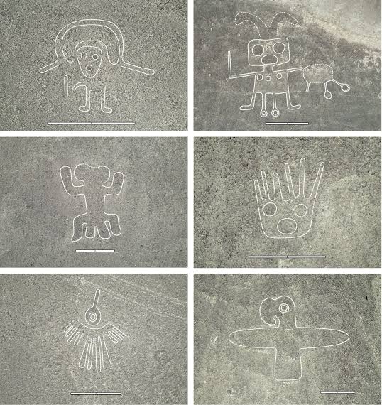 Los nuevos geoglifos incluyen representaciones de animales, figuras humanas y elementos abstractos, como orcas sosteniendo cuchillos y cabezas decapitadas. A diferencia de las figuras tradicionales, estos dibujos son más pequeños pero de diseño más complejo.