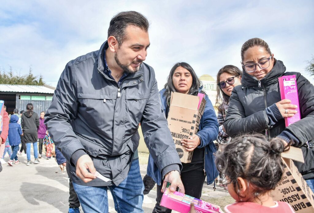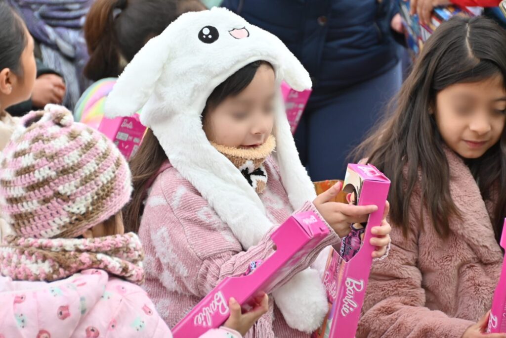 En la colonia Altamira de Guadalupe, los pequeños, bien abrigados con gorros y bufandas, esperaron con ilusión su regalo. Muñecas, superhéroes y juegos de mesa fueron los favoritos, entregados también por la Síndico, Brizeyla Iveet Rodríguez López.