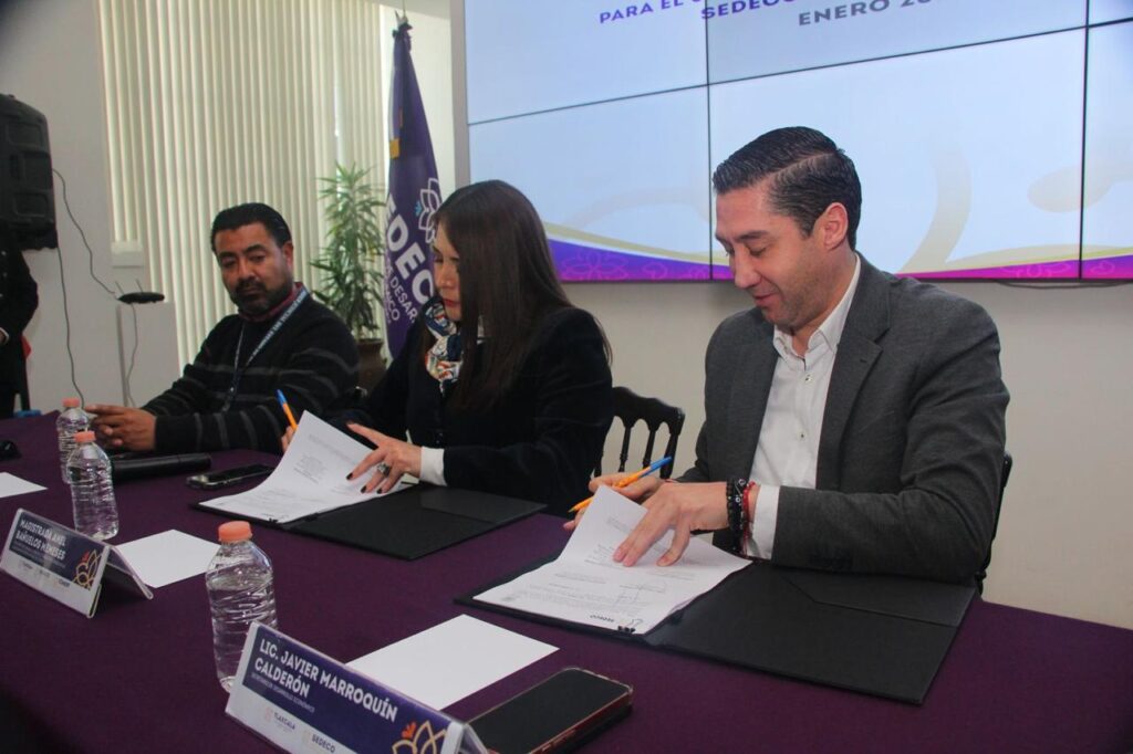 El secretario de Desarrollo Económico (Sedeco), Javier Marroquín Calderón y la presidenta del Tribunal Superior de Justicia y del Consejo de la Judicatura del Estado (TSJ-CJE), Anel Bañuelos Meneses, firmaron un convenio de colaboración para el uso de la plataforma digital Cero Papel Tlaxcala.