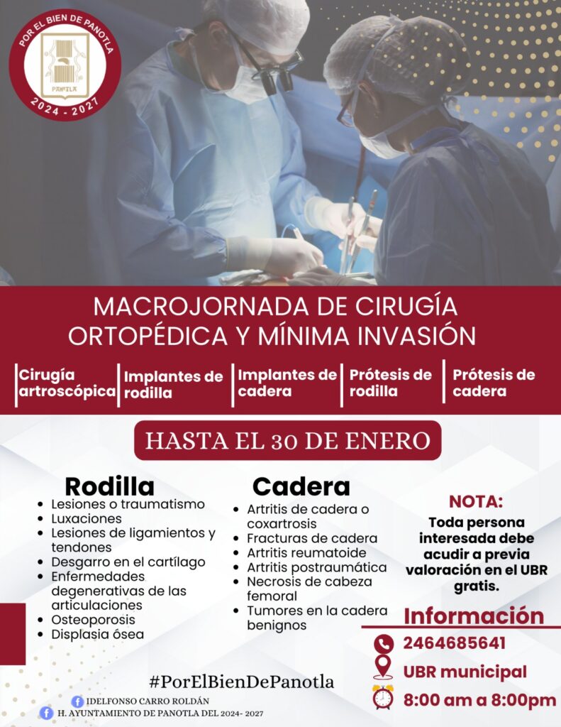 El Ayuntamiento de Panotla, en coordinación con el Gobierno del Estado de Tlaxcala a través de la Secretaría de Salud y Sedif Tlaxcala, anuncian “MacroJornada de Cirugía Ortopédica y mínima invasión” totalmente gratuita para los ciudadanos de Panotla que lo necesiten.