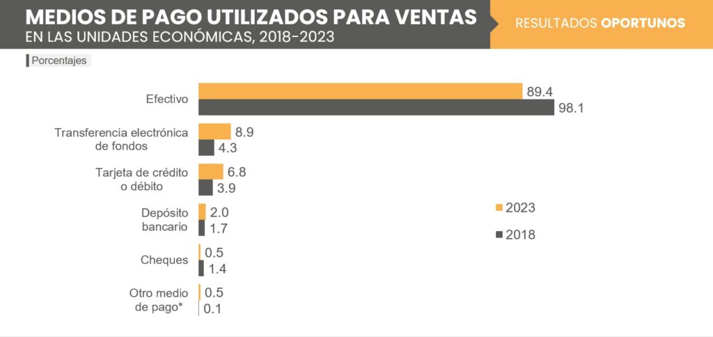 Cabe mencionar que se pudo detectar que, entre 2018 y 2023, el uso de efectivo se mantuvo como el principal medio de pago para las ventas, pero disminuyó de 98.1 a 89.4 por ciento. En contraste, la transferencia electrónica de fondos pasó de 4.3 a 8.9 % y el uso de tarjetas de crédito o débito aumentó de 3.9% a 6.8 %.