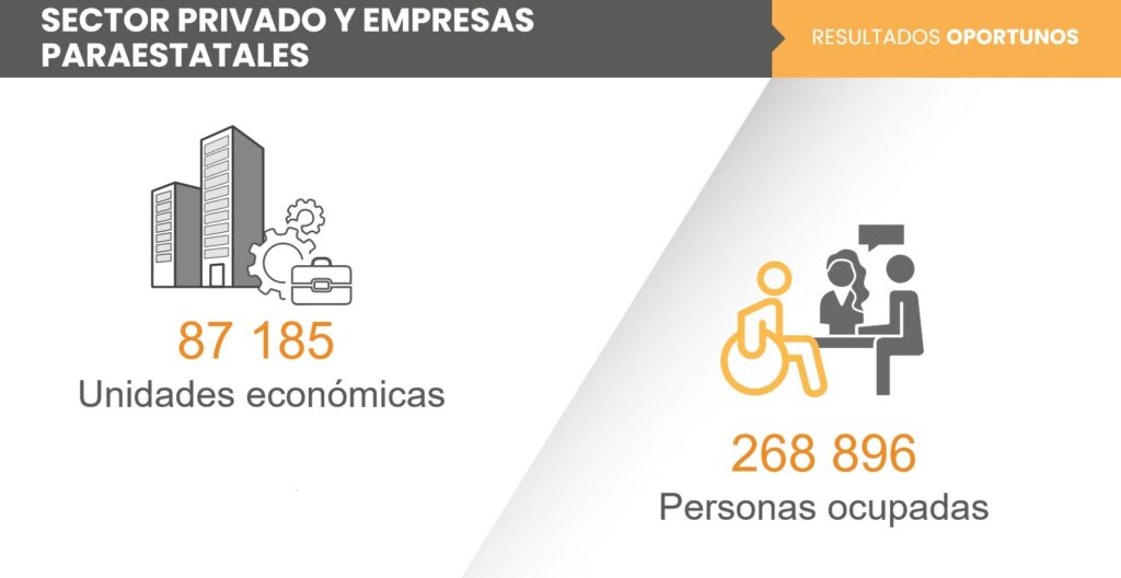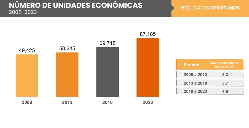 Cabe mencionar que, en el sector privado y en las empresas paraestatales, operaban 87 mil 185 unidades económicas en 2023 y en las que laboraban 268 mil 896 personas. En 2018, las unidades económicas sumaban 69 mil 715, empleando a 221 mil 625 personas.