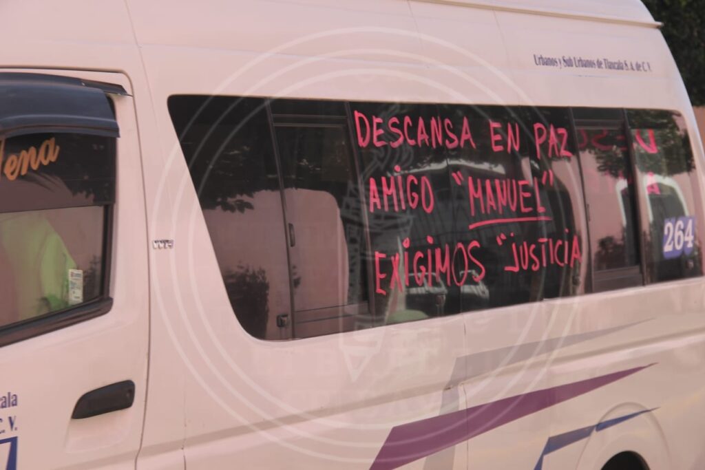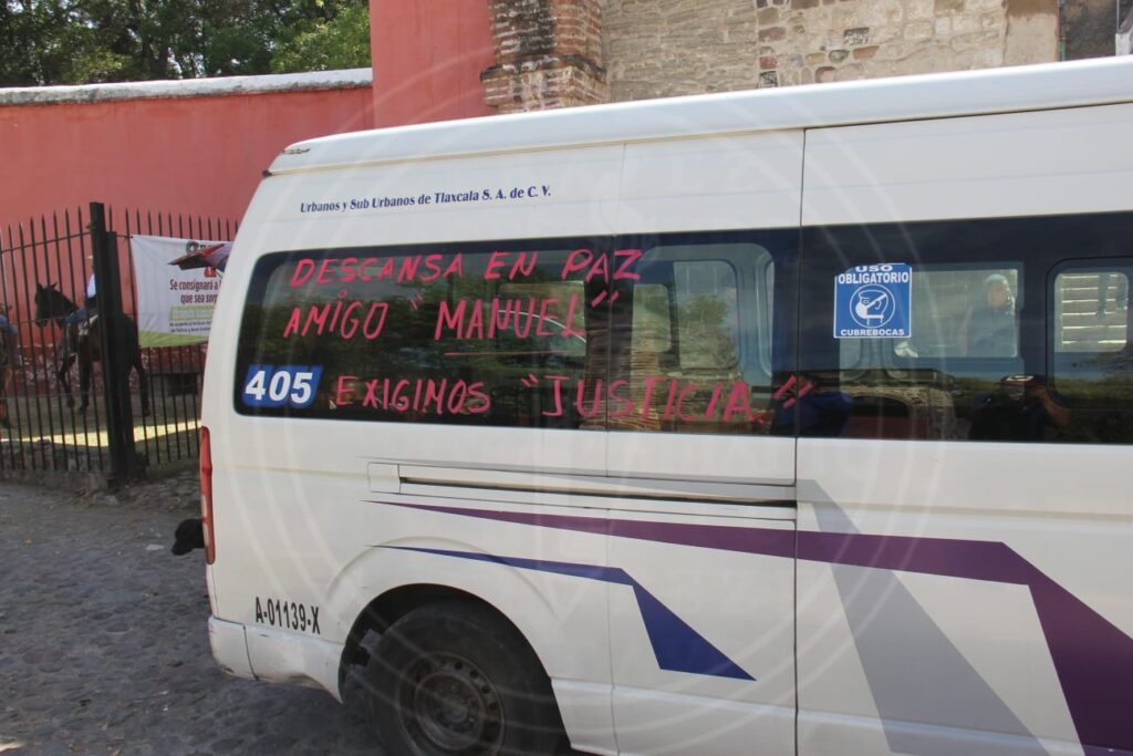 Trabajadores de ce transporte público de la empresa Urbanos y Suburbanos (USU) en Tlaxcala exigieron justicia por el asesinato de su compañero Manuel N., quien falleció después de ser asaltado en la colonia El Alto.